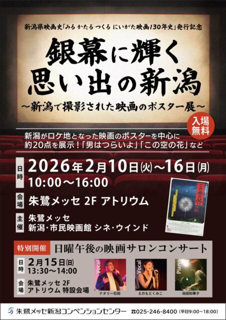 新潟県映画史「みる かたる つくる にいがた映画130年史」発行記念企画として開催されるポスター展。「男はつらいよ」「この空の花」など、新潟で撮影された映画のポスター約20点を展示します。スクリーンを彩った名作のビジュアルを通して、新潟の風景や物語をあらためて振り返る機会となる展示です。